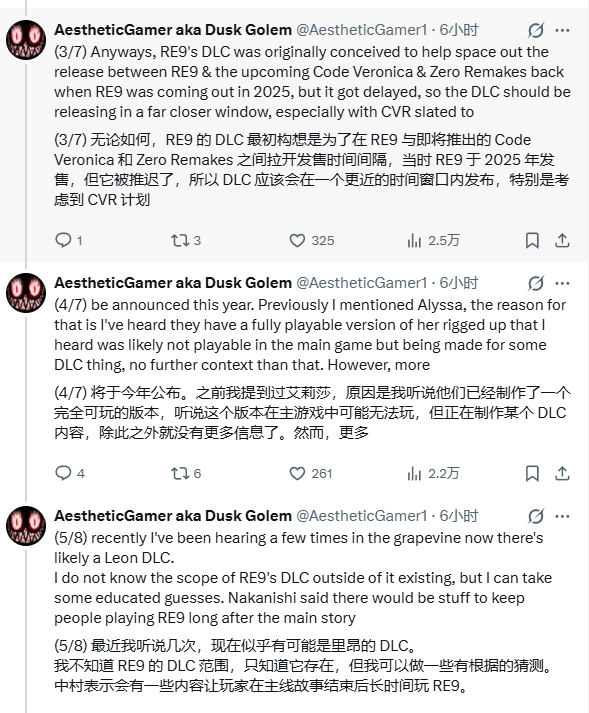 “據(jù)我了解,《RE9》的DLC已進(jìn)入后期開發(fā)階段——這其實(shí)并不讓人意外。畢竟從《生化危機(jī)5》起,這個(gè)系列的幾乎每一部作品都推出過擴(kuò)展內(nèi)容?!盌usk Golem如此說道。他還補(bǔ)充,這款DLC最初是為了填補(bǔ)《RE9》和《代號(hào)維羅妮卡》《生化危機(jī)0》重制版之間的時(shí)間空隙,但因?yàn)橛螒虬l(fā)售時(shí)間有所調(diào)整,現(xiàn)在這幾款作品的發(fā)售時(shí)間間隔變得更短了。