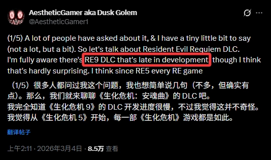 這一消息來源于《生化危機(jī)》系列的知名爆料人Dusk Golem。他近期在X(原推特)上分享了《生化危機(jī)9:安魂曲》DLC的相關(guān)信息,此外還提到了該系列后續(xù)幾部作品的潛在規(guī)劃。
