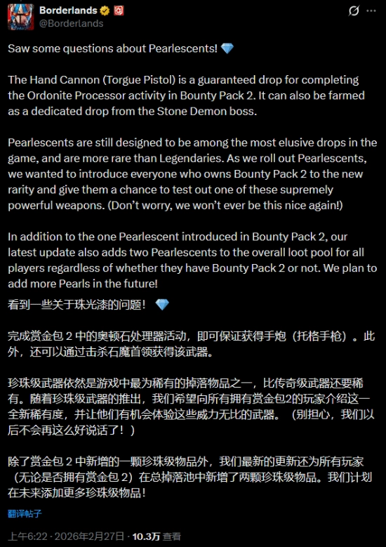 在確認(rèn)必定掉落珠光武器后,開發(fā)商Gearbox也迅速發(fā)文解釋了這一決定。官方表示,,開發(fā)團(tuán)隊(duì)“希望讓所有擁有賞金包2的玩家都能接觸到這一新稀有度,并有機(jī)會(huì)體驗(yàn)這些極其強(qiáng)力的武器之一”。同時(shí)他們也強(qiáng)調(diào),這樣的“友好待遇不會(huì)再有第二次”,并重申珠光武器“依然被設(shè)計(jì)為游戲中最難獲得的掉落之一”。