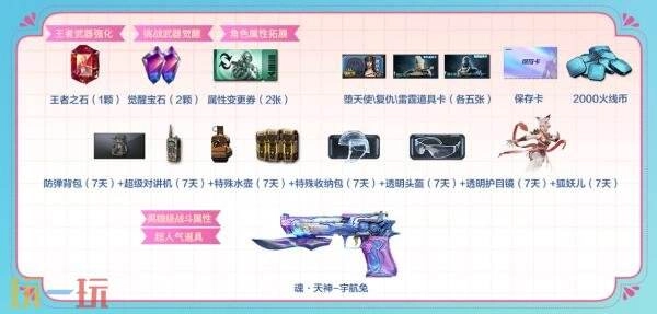 其他道具獎勵:防彈背包(7天)、超級對講機(jī)(7天)、特殊水壺(7天)、特殊收納包(7天)、透明頭盔(7天)、透明護(hù)目鏡(7天)、狐妖兒(7天)、火線幣*2000。