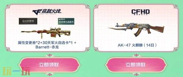 核心道具獎勵:Barrett-赤龍、屬性變更券*2、30天軍火自選卡*1、AK-47-火麒麟(14日)(CFHD端獎勵)。