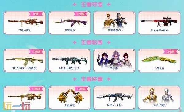 核心道具獎勵:幻神-丹鳳、王者雷影、王者潘多拉、Barrett-極光、QBZ-03-王者薔薇、M14EBR-玄武、關(guān)小雨、王者玉鋒、凰鳴之魄、王者巖刺、AK12-天啟、王者-魅影等。