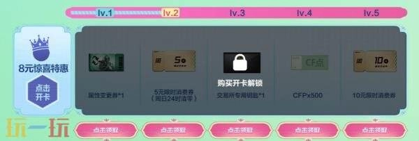 參與方法:未簽約、簽約及購買8元驚喜特惠卡的CFer,每周完成任務(wù)可免費(fèi)領(lǐng)取對應(yīng)獎勵,其中消費(fèi)券可優(yōu)惠購抽獎機(jī)會,未使用當(dāng)周失效,需保留可用保存卡。