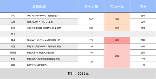 推薦理由:這套配置采用AMD 5600GT處理器與16GB內(nèi)存,適合辦公、影音及輕度游戲。集成顯卡省預(yù)算,1TB固態(tài)硬盤(pán)保障速度。未來(lái)可升級(jí)獨(dú)立顯卡與電源,性價(jià)比突出,適合學(xué)生與家庭用戶。