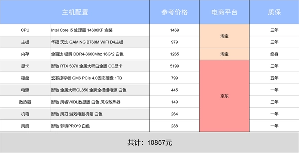 推薦理由:這是一套預(yù)算萬(wàn)元左右的白色主題游戲主機(jī)。整體搭配均衡,性價(jià)比高;支持DLSS 4.5的RTX 5070金屬大師白金版OC顯卡足以戰(zhàn)未來(lái),搭配上i5-14600KF處理器,能夠確保2K畫(huà)質(zhì)下,3A游戲與創(chuàng)作軟件穩(wěn)定運(yùn)行。
