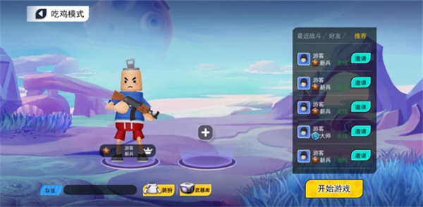 1、安裝好拉罐大作戰(zhàn)最新版本,運(yùn)行游戲,選擇吃雞模式,游戲中還有其他的游戲模式,開始匹配;