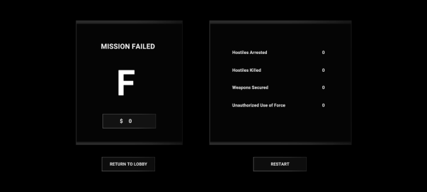 除非人質(zhì)或我方人員收到傷害,否則俘虜/逮捕的優(yōu)先級(jí)永遠(yuǎn)處于擊斃之上。如果想獲得S級(jí)評(píng)分,就必須抓捕嫌疑人,最好的方法就是使他們屈服,使用胡椒噴霧、豆袋槍和泰瑟槍等就可以讓敵人放棄抵抗,然后就可以逮捕了。直接擊斃敵人是最后的手段,盡量不要用。