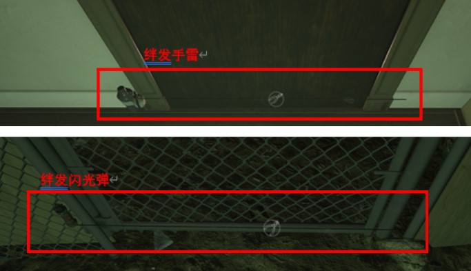 絆發(fā)爆炸物(以下簡(jiǎn)稱(chēng)絆雷)分為絆發(fā)手雷和絆發(fā)閃光彈2種,其安裝方式也有門(mén)前和門(mén)后兩種。絆雷較為明顯的標(biāo)志是爆炸體,但有些絆雷的爆炸體較為隱蔽或穿模,不易被發(fā)現(xiàn),因此判斷絆雷還應(yīng)以門(mén)下絆線(xiàn)為準(zhǔn)。