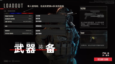 人物能攜帶一把主武器(步槍沖鋒槍霰彈槍?zhuān)?,一把副武器(手槍?zhuān)?,一種戰(zhàn)術(shù)裝備,兩種穿戴裝備,一種投擲物及一種戰(zhàn)術(shù)道具