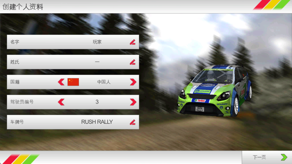 1、打開(kāi)拉力競(jìng)速3游戲,創(chuàng)建人物,創(chuàng)建好之后,點(diǎn)擊下一頁(yè);