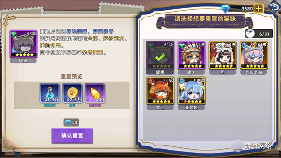 40級(jí)以下的貓貓免費(fèi)重生返還所有資源,40級(jí)以上的貓貓可以花50鉆石重生,實(shí)現(xiàn)無資源消耗換將!