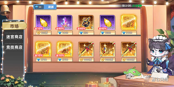 市場可以通過消耗游戲內(nèi)金幣,鉆石,迷宮幣,競技場幣來購買想要的資源,裝備等。