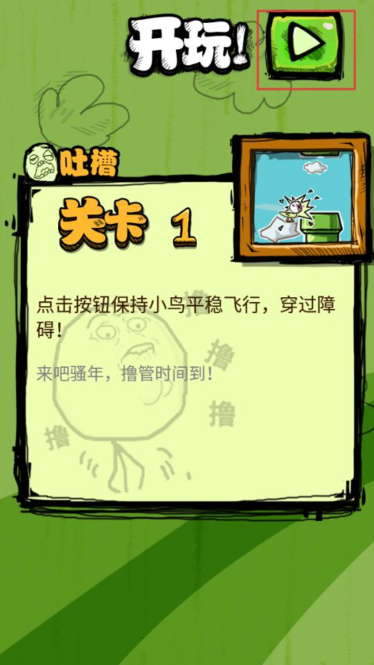 1、點擊開玩按鈕進入關(guān)卡,長按屏幕控制小鳥飛行高度,躲避綠色管道障礙。