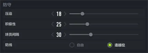 球員間隔是指防線之間的球員站位間隔,低球員間隔一般會對應(yīng)整體移動,防線之間的空擋不會顯出來,但是會被拉邊,拉出另一條邊路的空當(dāng);高間隔對應(yīng)球員大的覆蓋面積,球員不會輕易移開自己的防守位置,但這樣容易被打防線之間的空當(dāng)。一般高間隔對應(yīng)數(shù)量更多的后衛(wèi)(5后衛(wèi))補充缺點。低間隔是直觀感受就是總能看見防線的形狀,后衛(wèi)們整體移動較多,適合防對手的中路滲透。間隔基本上調(diào)到適中即可,根據(jù)喜好再上下調(diào)整。