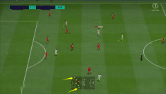 三中衛(wèi)陣型利好進(jìn)攻還體現(xiàn)在人數(shù),從圖中可以看到,除了門將外,我方十人全部來到中圈及以上,陣型重心十分靠前。同時兩個邊前衛(wèi)把進(jìn)攻寬度拉得很開,在黃色箭頭處可以清晰地看到,這就增加了我們橫向撕扯的空間,也加大對方左右防守的難度。
