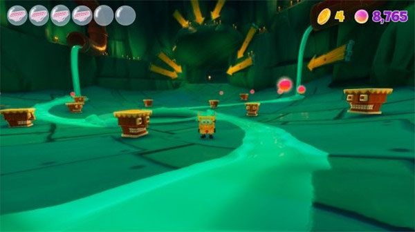 雖然收集不再是通關(guān)的主要目標(biāo),但游戲依然有著收集要素,只是換了另一種形式。當(dāng)收集到了一定數(shù)量的金幣便可以解鎖海綿寶寶的專屬服裝,本作收納了數(shù)十套經(jīng)典的造型服裝等著玩家收集。而另一個(gè)可收集要素需要在通過第一次關(guān)卡之后,才能從NPC接取的支線任務(wù)。