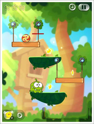 2、點(diǎn)擊Roto放開木頭,看準(zhǔn)時機(jī)再切割糖果線,使糖果準(zhǔn)確的掉落到Roto手上,等Roto到最左邊點(diǎn)擊Roto。等糖果掉落到綠色怪物嘴里輕松過關(guān)。