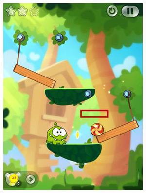 額外任務(wù)技巧:額外任務(wù)的挑戰(zhàn)在于不能收集星星。前幾個步驟與普通關(guān)卡相同,關(guān)鍵在于切割糖果線時要等到Roto移動到最右邊。此時再切割糖果線,糖果會先掉落到木頭上,從而實(shí)現(xiàn)不收集星星也能過關(guān)的目標(biāo)。