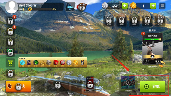 1、安裝游戲,直接進(jìn)入到游戲的主頁(yè)面中,可以直接點(diǎn)擊狩獵開(kāi)始游戲