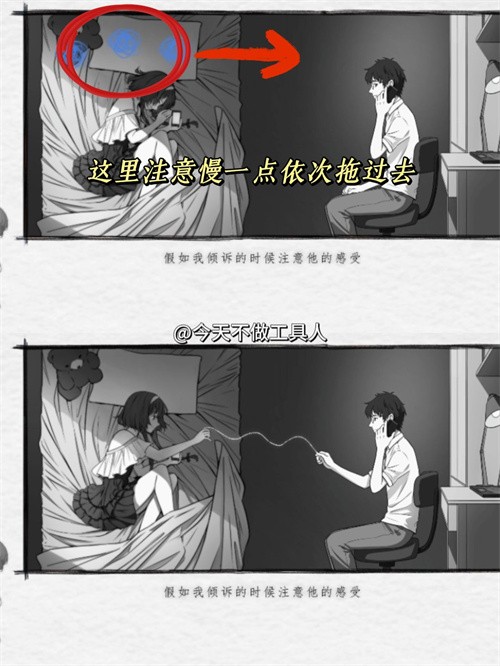 7. 傾訴:依次將藍(lán)色語(yǔ)言團(tuán)拖到男主位置,每拖動(dòng)一個(gè)就聽(tīng)男主的回復(fù),聽(tīng)完后再拖動(dòng)下一個(gè)。