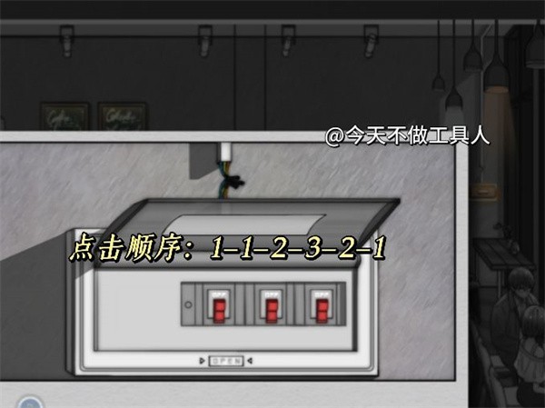 從工具柜中拿出工具,修理電箱,接著按下紅色按鈕,直到最近的三盞燈亮起。