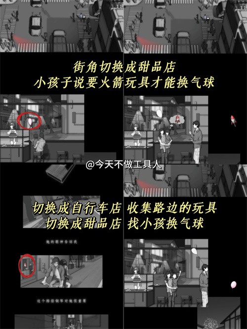 當(dāng)街角的店鋪是甜品店時(shí),小朋友提出要用玩具換一個(gè)氣球。我們先將店鋪切換為自行車店,在那里向下滾動(dòng)可以找到玩具火箭。然后再回到甜品店,向小朋友要那個(gè)粉色的氣球。