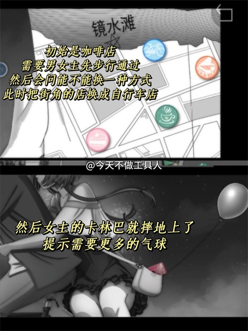 ③向下滑,騎自行車通過(guò),此時(shí)女主的卡林巴摔地上了。提示需要更多的氣球。