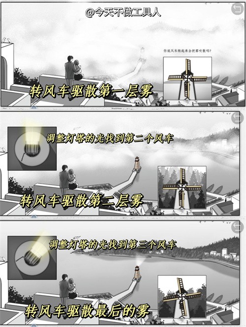 9. 吹霧:先轉(zhuǎn)動(dòng)第一個(gè)風(fēng)車,接著通過(guò)調(diào)整燈塔定位到第二個(gè)風(fēng)車并轉(zhuǎn)動(dòng)它,最后再次調(diào)整燈塔找到第三個(gè)風(fēng)車,并完成轉(zhuǎn)動(dòng)。