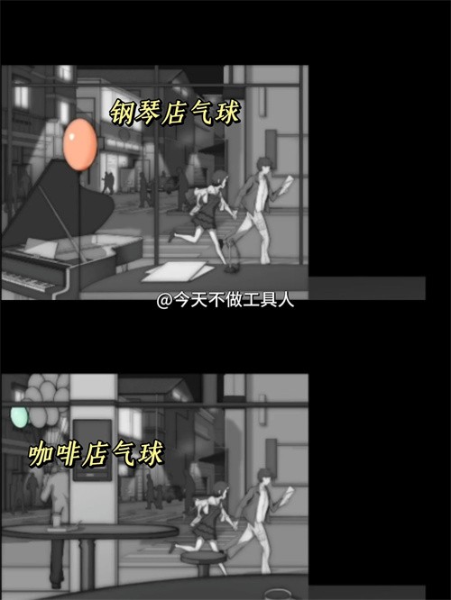 向上滑動(dòng)回到地圖,將街角的店鋪分別更換為鋼琴店和咖啡店,這樣可以直接獲得黃色和綠色的氣球。