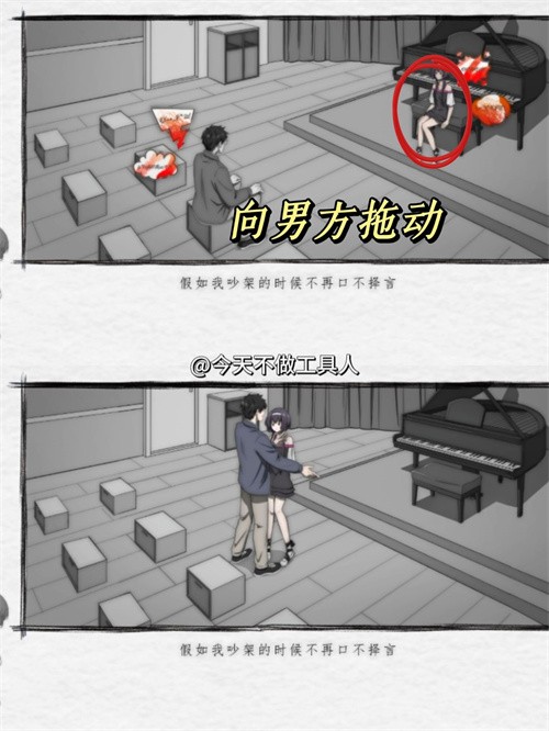 2. 爭(zhēng)吵:分別拖動(dòng)兩個(gè)紅色言語(yǔ)團(tuán)回到男主、女主身體里
