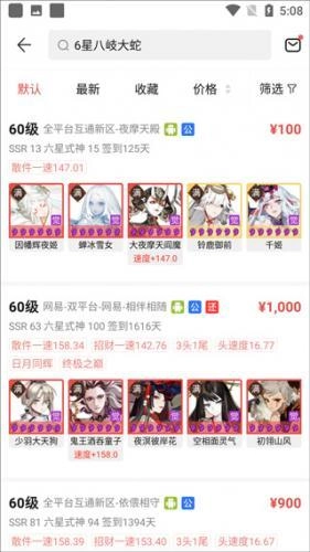 2、在藏寶閣搜索你想要的賬號類型,比如你喜歡某個SP角色,就搜那個式神的名字。或者喜歡資源號,就搜索勾玉大于一萬。