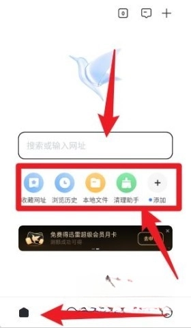 2、首頁可輸入網(wǎng)址進行搜索,底部還提供收藏、瀏覽歷史和本地文件等快捷入口。