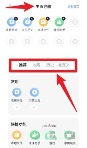 3、在首頁點擊“主頁導(dǎo)航”,即可對首頁內(nèi)容進行自定義設(shè)置。不僅能夠添加和移除常用工具,還能在推薦、歷史、自定義欄目之間自由切換。
