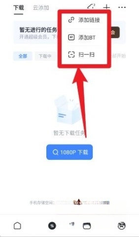 4、在頁面上,點擊右上角的“+”,即可添加鏈接、BT任務(wù),或者使用掃一掃功能,以實現(xiàn)本地或云端的任務(wù)管理。