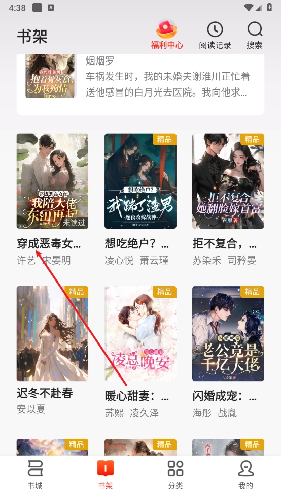 3、點(diǎn)開“書架”板塊,便能瞧見收藏的小說資源。