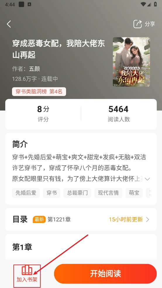 2. 一鍵點(diǎn)擊即可打開并進(jìn)入小說詳情頁面,隨后點(diǎn)擊頁面左下角的“加入書架”選項(xiàng)。