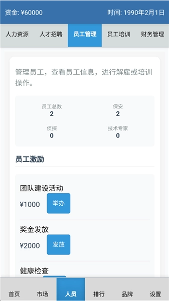 員工類型:保安、偵探、技術專家三種類型