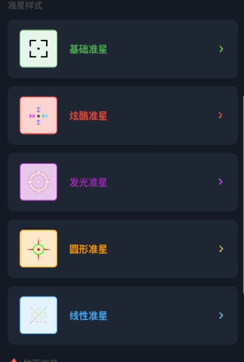 5、點擊底部第三個圖標準星可以開啟準星樣式,支持基礎準星、炫酷準星以及發(fā)光準星、圓形準星、線性準星等