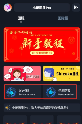 1、使用小茂畫質(zhì)助手pro后,在首頁能夠進行diy代碼操作以及還原配置。