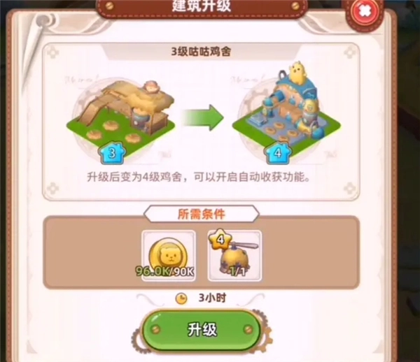 2從2升級到3(解鎖白雞,每小時產量2枚,喂食5次后可售賣,收獲需手動操作,食槽容量80)