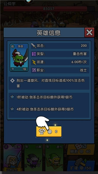 1、在游戲中,點擊下方的角色即可進行上陣,選擇一個后其余的兩個角色就會消失。每個職業(yè)內(nèi)部也會有不同能力的英雄,用金色,紫色,藍色,綠色,不同的顏色來代表不同英雄的強度
