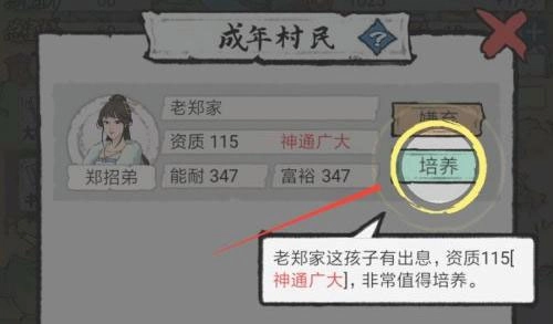 3、村民的選擇和培養(yǎng):選擇這個機制較為簡單,只需要看他的資質(zhì),一般來說110以上比較好,有時間的可以刷到120以上,不要歪瓜裂棗,會為你后面的培養(yǎng)節(jié)省很多精力、培養(yǎng)一個村民20次就可以滿級,建議培養(yǎng)高知名度人物,因為他們是出頭鳥,能不能打好這一仗還得看他們,等到你的第一梯隊都升滿級之后,你也就不缺銅錢了,只需要等待 培養(yǎng)(能看廣告的可以把同時培養(yǎng)的人數(shù)升級)