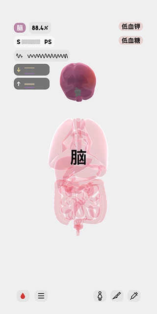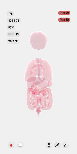 8、屏幕右上角顯示的是該人體模型的異常狀態(tài),例如現(xiàn)在,她正處于低血鉀和低血糖的狀態(tài)中。