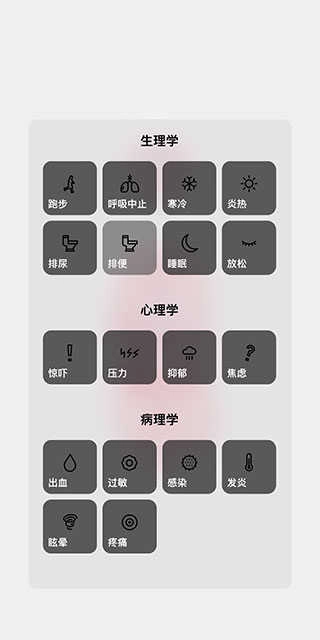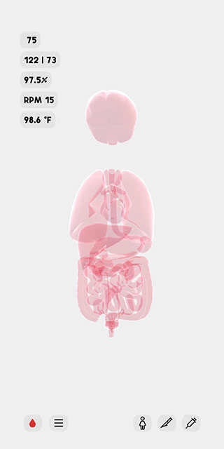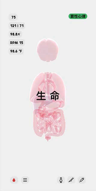 10、輕點(diǎn)右下角的人體圖標(biāo),便能為該模型設(shè)定不同狀態(tài),涵蓋生理學(xué)、心理學(xué)以及病理學(xué)這三個方面,進(jìn)而觀察人體在各異狀態(tài)下的反應(yīng)。