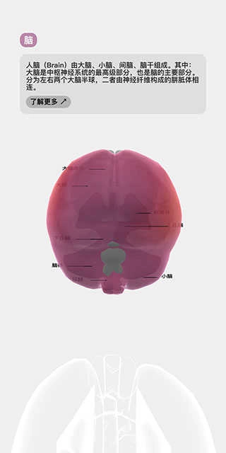 7、再次點(diǎn)擊該器官,便會展示其具體的說明信息,同時在模型上標(biāo)注出器官的構(gòu)成。若點(diǎn)擊下方的“了解更多”按鈕,也會跳轉(zhuǎn)至瀏覽器。