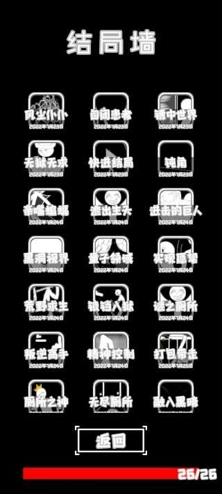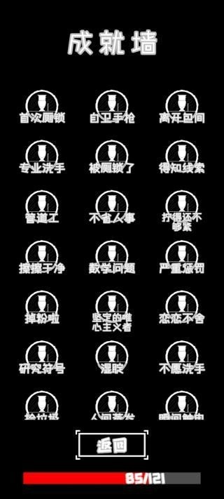 口袋淘一下紙→上衣口袋→查看左側(cè)隔板→敲一下隔板→不敲了→往隔板下方縫隙里望一下→伸手去抽一張紙(一直抽能獲得10張紙,點擊物品欄使用衛(wèi)生紙擦PP)→不想出去(成就:戀戀不舍)→再等一下(一直選擇等待選項)→結(jié)局:自閉患者