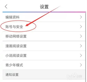 在設(shè)置頁面中選擇“賬號與安全”選項(xiàng)繼續(xù)操作。