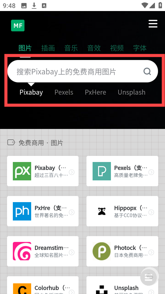 3、在頂部搜索欄輸入關鍵詞,比如要查找pixabay上免費商用的圖片資源時就可如此操作。