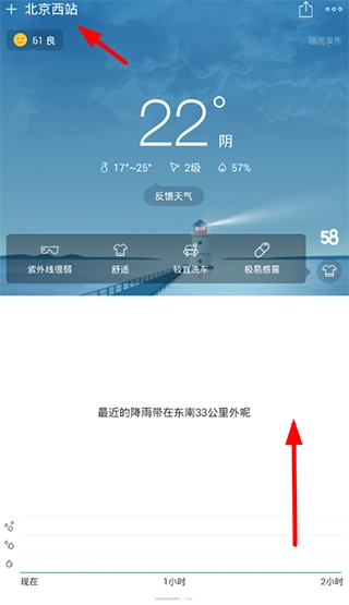 1、打開(kāi)彩云天氣的主界面,手指從下往上滑動(dòng),拉到下方的詳情內(nèi)容。
