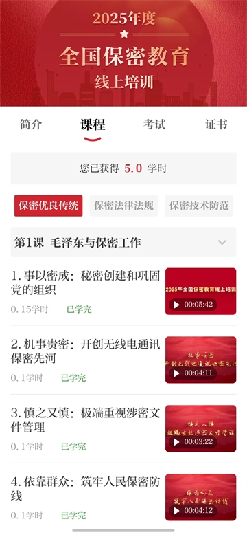 進(jìn)入系統(tǒng),點(diǎn)擊“課程”開始學(xué)習(xí)。課程內(nèi)容包含保密優(yōu)良傳統(tǒng)、保密法律法規(guī)、保密技術(shù)防范和保密警示案例4部分,以視頻、音頻為主??稍趯W(xué)習(xí)頁面隨時(shí)查看已獲得的學(xué)時(shí)。